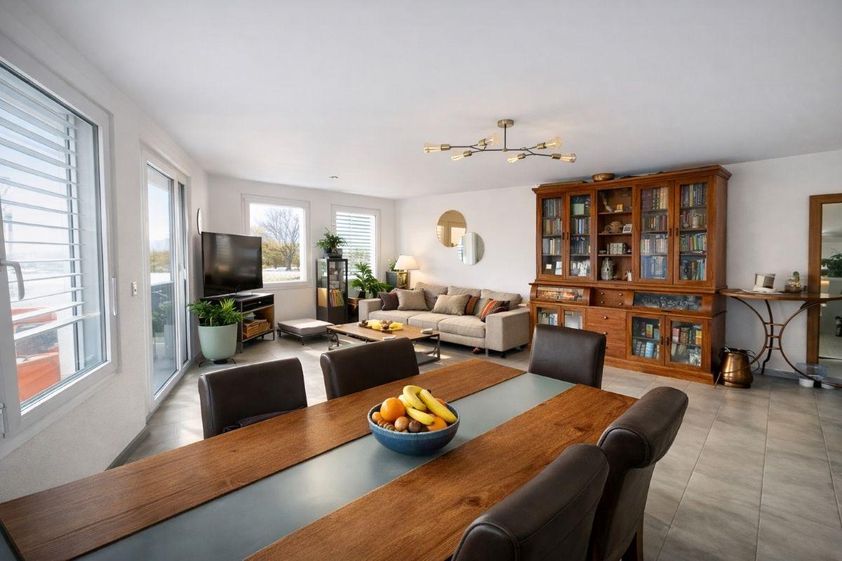 Baigné de lumière, l'appartement séduit par ses beaux volumes généreux et son balcon idéalement orienté, offrant une vue dégagée sur la campagne et les montagnes, avec pour seul vis-à-vis des prairies et des chevaux, garantissant un intimité absolue et une atmosphère bucolique particulièrement recherchée.