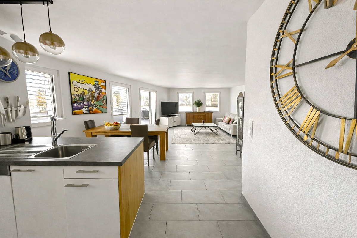 - Cuisine entièrement équipée avec îlot central, ouverte sur un séjour spacieux et lumineux