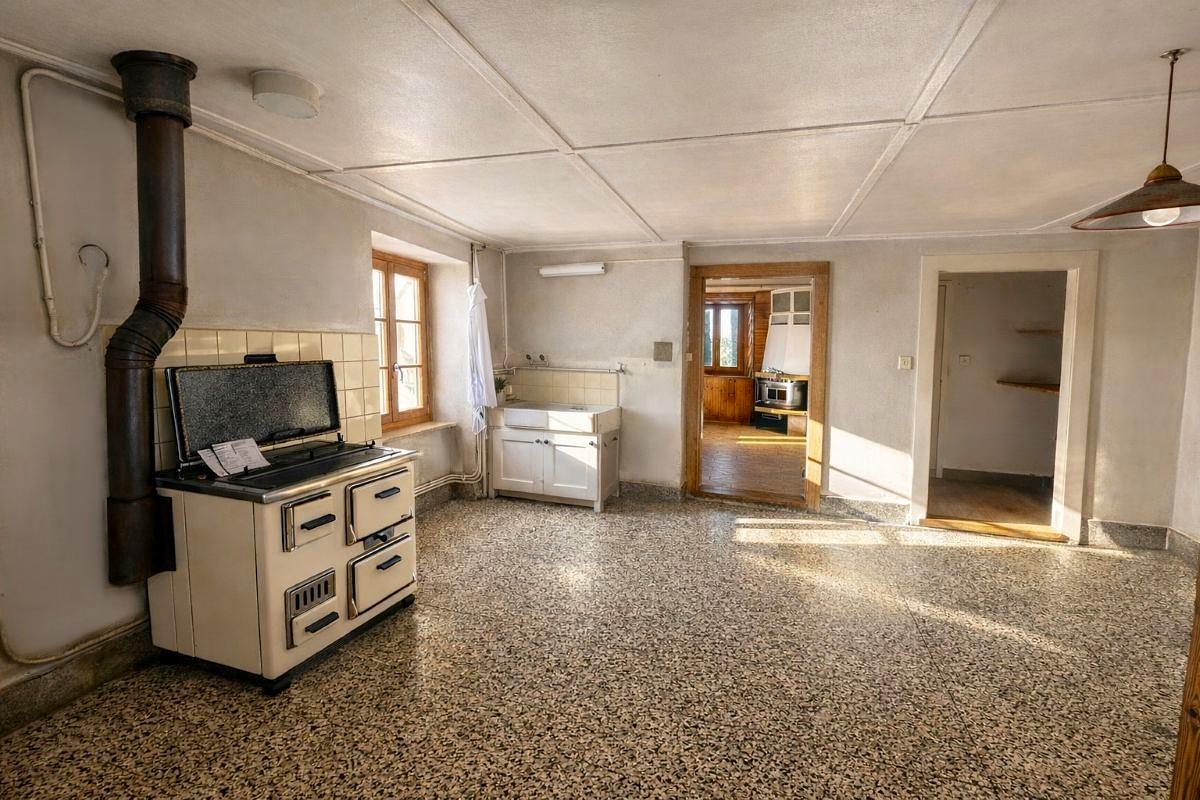 Hall d'entrée avec accès à une cave voûtée, cuisine/salle à manger, séjour avec fourneau à molasse, chambre avec une cheminée et une salle de bains / WC